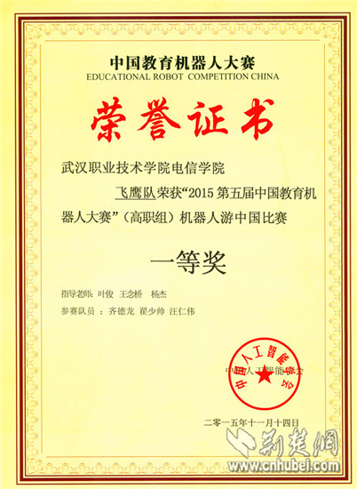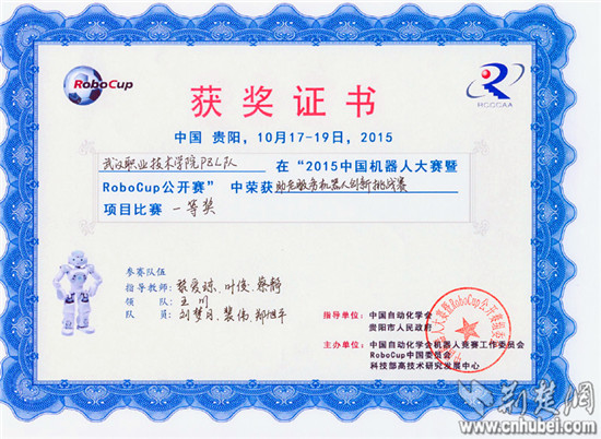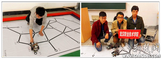 图为:第五届全国教育机器人大赛期间,武职电信学院代表队测试机器人