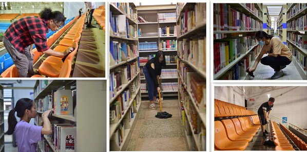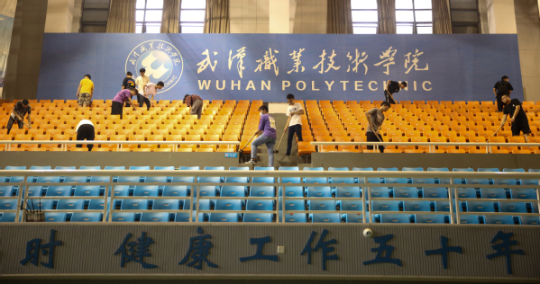 (大学生记者 何蝶 彭莹莹 摄影 胡爱妮 张宇轩)9月10日上午,在学校体育馆内、图书馆里一派热闹的场景,有人拖地、有人擦椅子、有人除尘、有人清理垃圾、有人整理物品……这场景不仅仅是劳动场面,更是软件19305班和应英19303班同学们正在进行的劳动实践必修课。