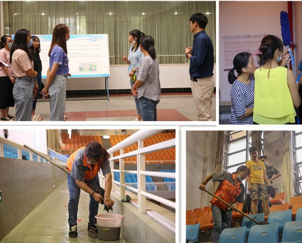 9月10日上午,在学校体育馆内、图书馆里一派热闹的场景,有人拖地、有人擦桌椅、有人除尘、有人整理物品……这场景不仅仅是劳动场面,更是软件19305班和应英19303班学生正在进行的劳动实践必修课。