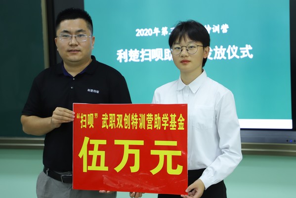 利楚商务副总裁蒋文龙谈起与武职优秀校友王朋共同创业的种种坎坷,寄语学员们勿忘初心,砥砺前行,做靠谱的人,干靠谱的事。作为创办企业的武职校友,他代表公司宣布向武职特训营设立为期五年共25万元的助学金,同时为帮助学弟学妹实现创业梦想,公司每年捐赠价值不少于20万元的产品设备用于开展市场创业实践。