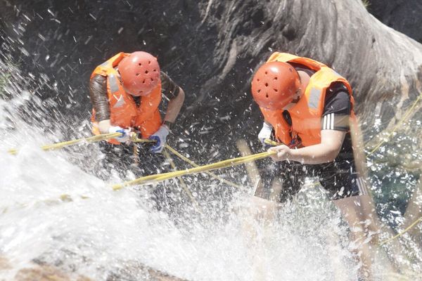 第二天,学员们面对的是极具挑战的溯溪探险活动。在教练确认场地及活动安全装置后,学员们仍然要克服对急流险滩心理恐惧、挑战身体的生理极限,携手完成滑瀑和溯溪任务。在心理与体力的双重考验下,学员们的鼓励声响彻山谷;在应对激流的冲击时,学员们筑起人墙对抗;在接近终点时,精疲力竭的学员们相互扶持着走完全程。