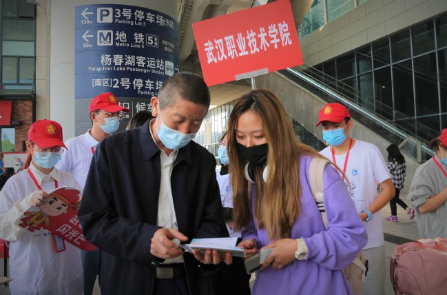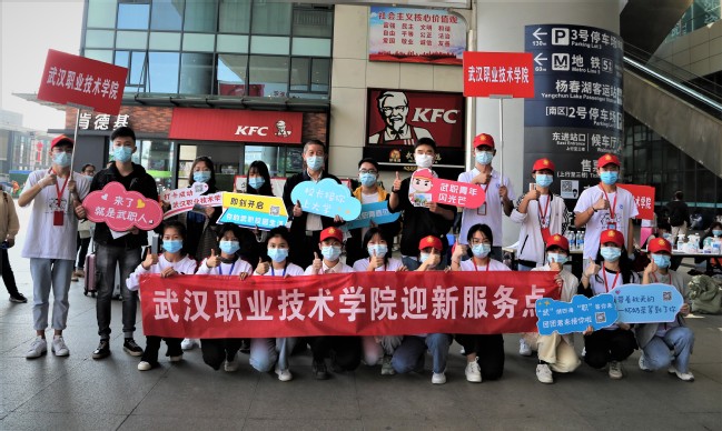 武汉职业技术学院党委书记、校长李洪渠在武汉火车站迎接新生