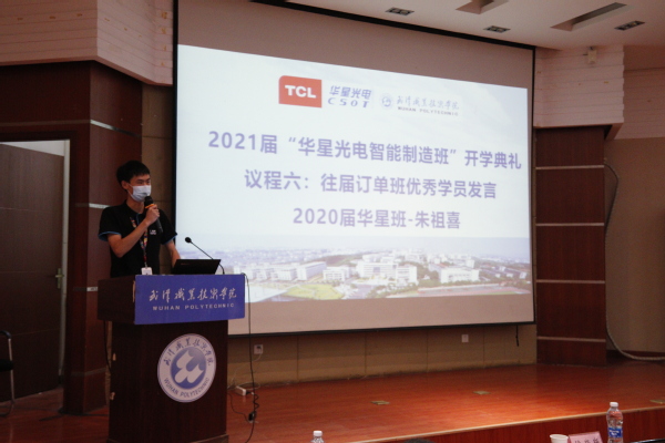 随后,企业方班主任代表石锦波、校方班主任代表雷迪、2020届华星班学员朱祖喜、2021届华星班学员代表左健成依次上台发言。