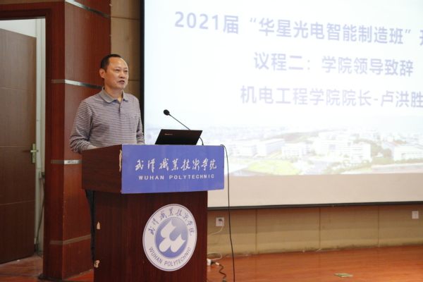 机电工程学院院长卢洪胜在致辞中对出席开班仪式的企业领导表示诚挚的欢迎,并向武汉华星自2016年合作以来在专业建设、教师培养、学生就业、社会培训、联合培养等方面给予的支持表示感谢;勉励订单班学员们坚定初心、信守承诺,早日成长为优秀的武职华星人。卢洪胜表示,机电工程学院将积极推动和华星的深度合作,全力支持订单班教学,把人才培养质量严格落到实处。