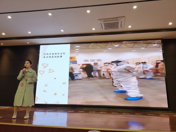 “今年年初,大家有没有看过这样一则视频呢?”建筑工程学院新疆少数民族学生加依达尔•铁勒阿德一上台就以武汉方舱医院护士长巴哈尔古丽的一段哈萨克舞蹈抓住了大家的眼球。紧接着,她讲述了自己疫情期间返校的经历和感受:“从社区、到警察、再到医护人员,我身边的老师同学们他们不仅保障我的生命安全,同时还关注着我的心理状态。我想当今世界,只有我们的祖国能做到这样,当困难来临之时,每一个人都坚守在自己的岗位,肩负责任毫不退缩。”