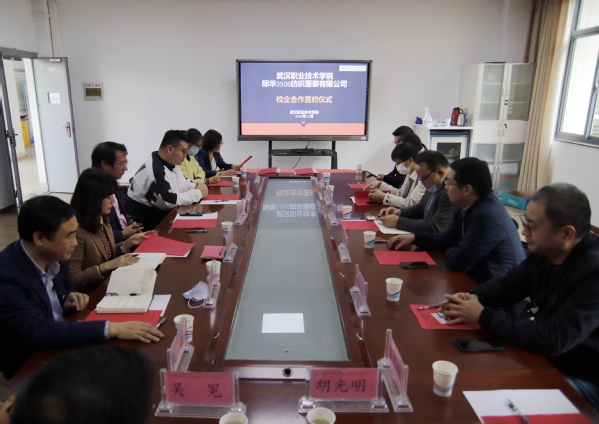 武汉市人力资源和社会保障局人才服务中心处长熊军、职业技能鉴定指导中心主任吴军、人才服务中心高校就业部部长赵凯,际华3506纺织服装有限公司党委副书记杨汉武、武汉驷介企业管理咨询有限责任公司总经理吴冕,武汉职业技术学院合作发展处处长杨忠旭、继续教育与培训处处长熊鹤群、纺织与服装工程学院服装教研室主任孔莉出席签约仪式。签约仪式由纺织与服装工程学院院长戴冬秀主持。