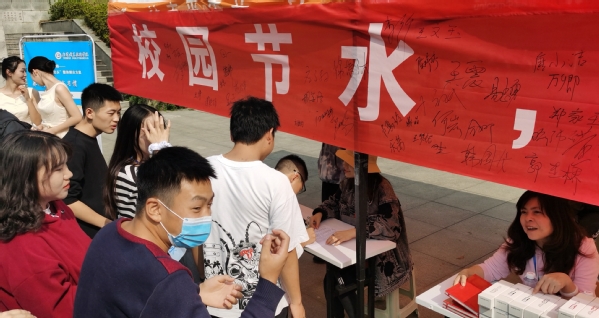 师生在校园节水倡议横幅上签名