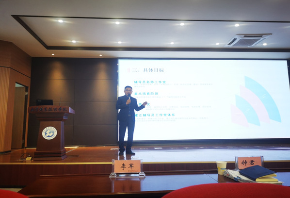 最后,学生工作处处长钟君以《辅导员工作室体系》建设为主题,提出了建立辅导员工作室体系、提质培优、重点培训、打造名师工作室“四步走”的建设思路,从工作室申报条件、工作室类型、工作室申报程序以及考核评估四方面具体讲解了辅导员工作室的建设方法。