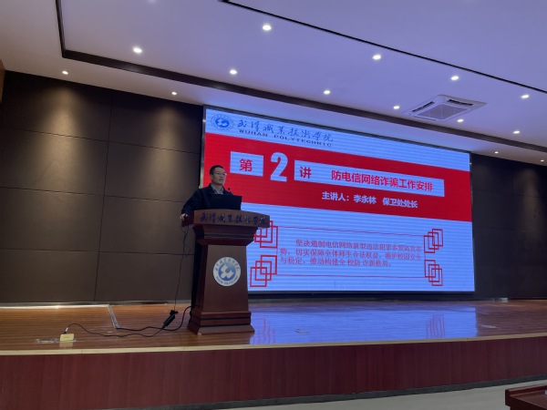 武汉市关南派出所所长黄荣以防电信网络诈骗为题,从学生受骗现状、常见诈骗类型、防诈骗措施等三个方面进行了讲解。他以“兼职刷单类诈骗”、“网上投资诈骗”、“交友杀猪盘式诈骗”、“网络贷款诈骗”、“裸聊诈骗”、“冒充亲人借钱诈骗”等常见的电信网络诈骗形式为例详细地剖析了其诈骗的特点和防范的要点,并指导大家如何在学生中开展防电信网络诈骗教育。随后,学校保卫处处长李永林对学工系统开展防电信网络诈骗工作进行安排,指出全体师生要认识再提高、责任再落实、防范再到位,提升校园防控能力,推动构建全校防诈新格局。