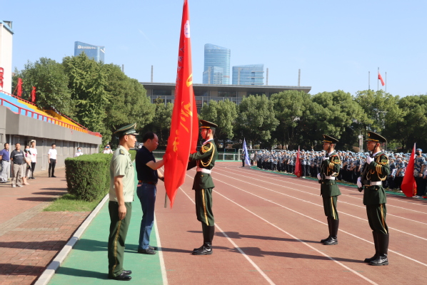 武汉职业技术学院国旗仪仗队出示军训师旗,副校长刁元斌为军训师授旗,在全体新生的注视下,授旗仪式完成。