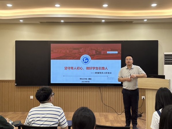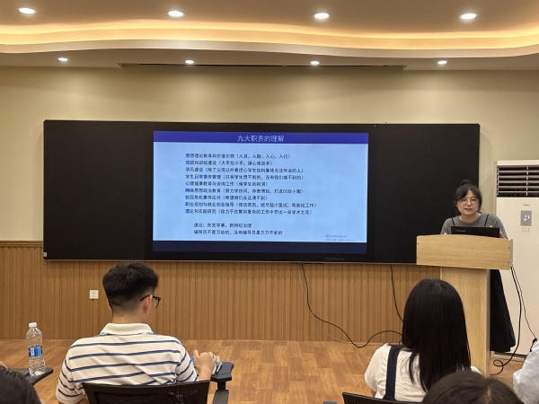 学生工作处副处长夏挺以学校辅导员工作和学生管理相关文件解读为主线,重点围绕学风建设、职业规划与就业创业指导、理论和实践研究等关键环节为新进辅导员释疑解惑。