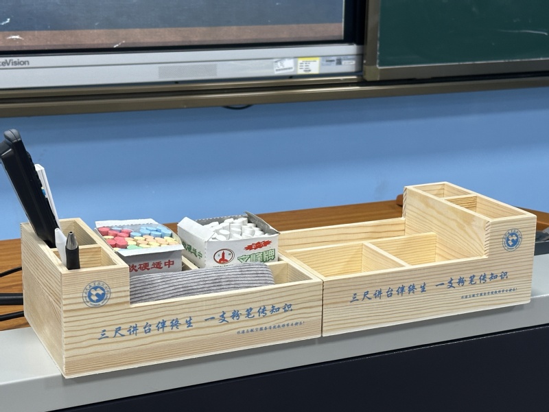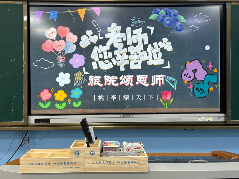 课间时光的“惊喜速递”更让老师们直呼暖心。学生志愿者化身“感恩使者”,提前在教室外等候,铃声一响便送上学院准备的专属礼物——艾香锤与定制粉笔收纳盒。艾香锤由艾草填充、清香四溢,锤一锤能缓解长时间站立的肩颈疲劳。粉笔收纳盒印着学校的Logo与“三尺讲台伴终身,一只粉笔传知识”的标语,实用又具纪念意义。