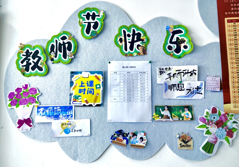 除此外,旅游学院还在一楼装扮了教师节专题涂鸦墙,墙面绘满教师节卡通插画、绽放的康乃馨和“教师节快乐”的艺术字,这些充满童趣与诚意的创作,让整个楼梯间都弥漫着温馨的节日氛围。