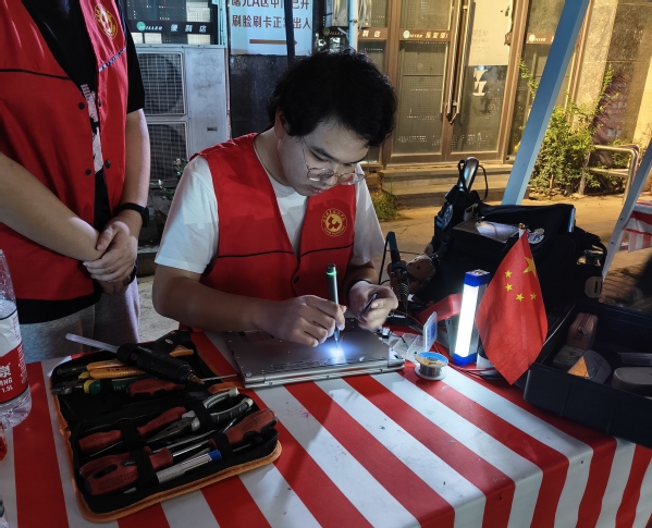 光电与信息工程学院的家电维修摊位前围着不少来求助的居民,志愿者们的额角渗着汗,手里的活却没停过。“我这笔记本开不了机,麻烦你们看看?” 一位居民抱着电脑赶来,语气里满是期待。无线电协会志愿者们立刻接过设备,一边安抚居民 “您别着急,我们先检查”,一边动手拆解外壳、检测线路。经过一番努力,电脑重新运行了起来。居民高兴得合不拢嘴:“太感谢了,这又能用几年啦!你们技术好,还这么有耐心,真是好样的!”