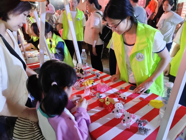 手工艺品义卖区同样热闹,精美的扭扭棒挂件、创意十足的编织珠串吸引着居民目光。一位小朋友拉着母亲的手,眼巴巴地看着一个珠串小兔子,家长笑着问价格。生物学院DIY手工协会志愿者连忙介绍:“这是我们亲手做的,义卖的钱会用于社区困难群体的帮扶或者社区设施建设。”家长拍手称赞,爽快买下以表支持。