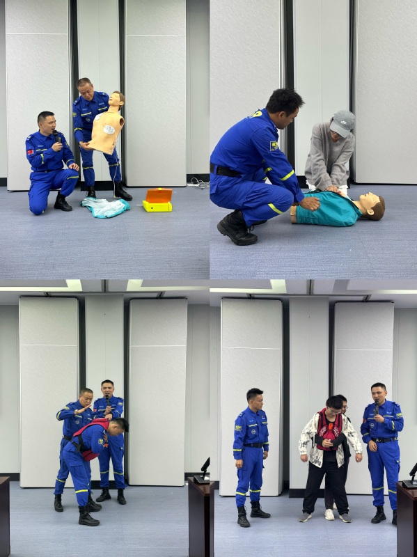随后,武汉职业技术大学智能商务学院教师、蓝天救援队队员杨俊超携队友邓承恩、杨堃、安绪万开展急救技能培训。专家团队结合校园常见意外,以“理论+实操演示”方式系统介绍心肺复苏(CPR)的原理、操作流程及AED使用方法;针对异物卡喉意外,团队演示了海姆立克急救法在不同人群中的实施要点。现场学生踊跃参与模拟演练,通过教具实操强化“时间就是生命”的急救意识,切实提升应对突发状况的能力。