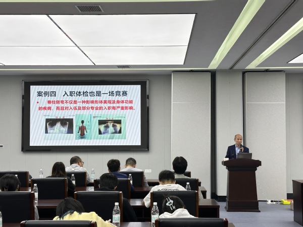 讲座伊始,公共卫生领域资深专家、校医院院长沈泓海教授以《打好健康“基础盘”,跑赢生涯“马拉松”》为题开讲。沈院长结合大学生实际,从医保政策与医学常识两个维度展开,对比大学生医保与居民医保差异,结合真实案例强调持续参保的重要性,纠正“参保无用”的认识误区。同时,沈院长聚焦就业关联疾病防控,特别指出长期食用无卫生许可的外卖或摊贩食品,可能增加感染乙肝、肺结核等疾病风险,不仅威胁健康,更可能成为入职、入伍体检的“绊脚石”。
