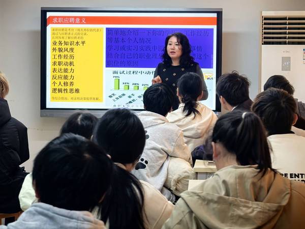 国家级普通话测试员、学校继续教育与培训处杨瑾副教授受邀担任主讲。她以《面试通关秘籍:一起拆穿求职“盲盒”!》为主题,结合丰富职场经验与生动表达,从学生常见的表达焦虑切入,立足用人单位视角,系统讲解面试过程中需把握的四个关键要点:传递积极态度、凸显个人不可替代性;适配不同场合着装,塑造专业形象;正视潜在偏见,强化核心竞争力;善用STAR法则,以数据和事实展现个人能力。