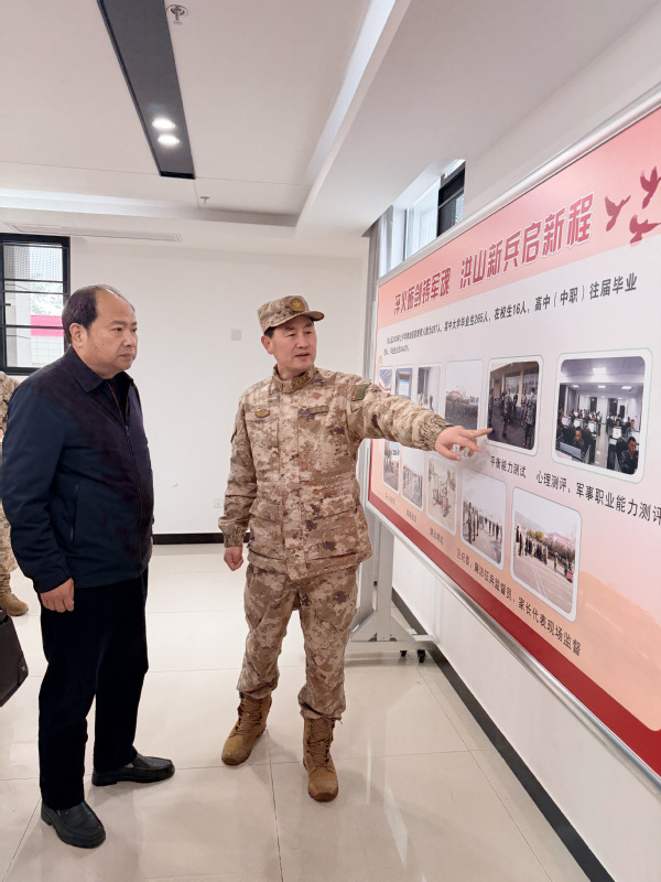 在训练基地,洪山区人武部部长王兴松详细介绍了役前教育训练的整体安排、日常管理及训练进展,双方就军地协同推进征兵后续工作、做好入伍学子服务保障等事宜深入交流,搭建起军地联动、共育英才的坚实桥梁。