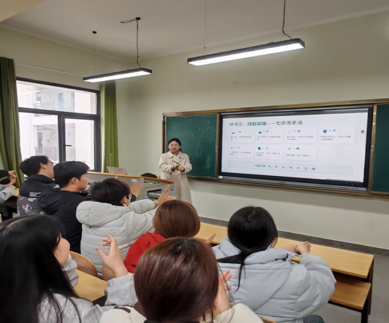 光电与信息工程学院在班会中引入 “健康知识数字炸弹” 互动游戏,以寓教于乐的形式巩固防治要点;数智商务学院、旅游与航空服务学院融入办公消杀、岗位防护等实操讲解,将结核防护知识与职业场景有机结合;建筑工程学院打造“教室 + 社区 + 线上”三维宣讲阵地,为实习学子开设线上主题班会,辅导员深入宿舍开展面对面科普宣讲;生物工程学院生悦健康志愿者协会发挥专业优势,线下设点开展实操示范,现场指导学生规范佩戴口罩、掌握七步洗手法,助力大家在实操中熟练掌握防护技能。